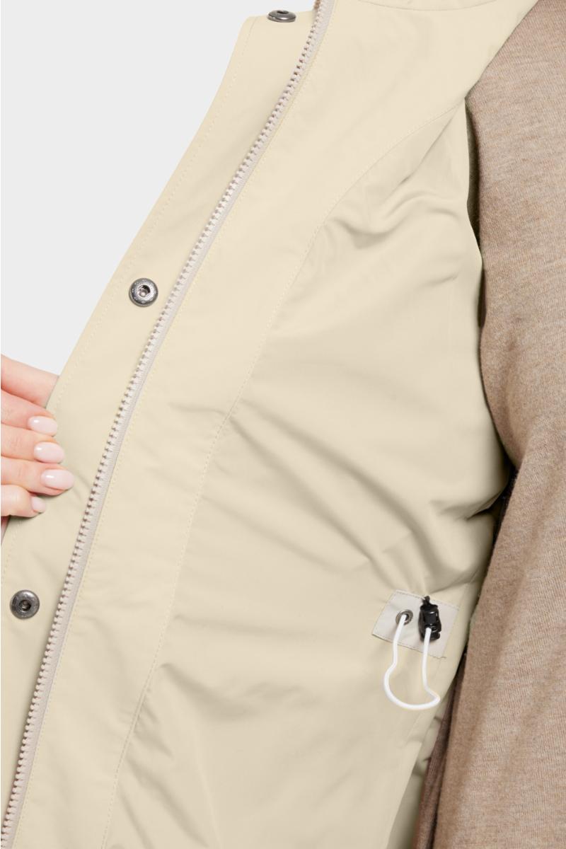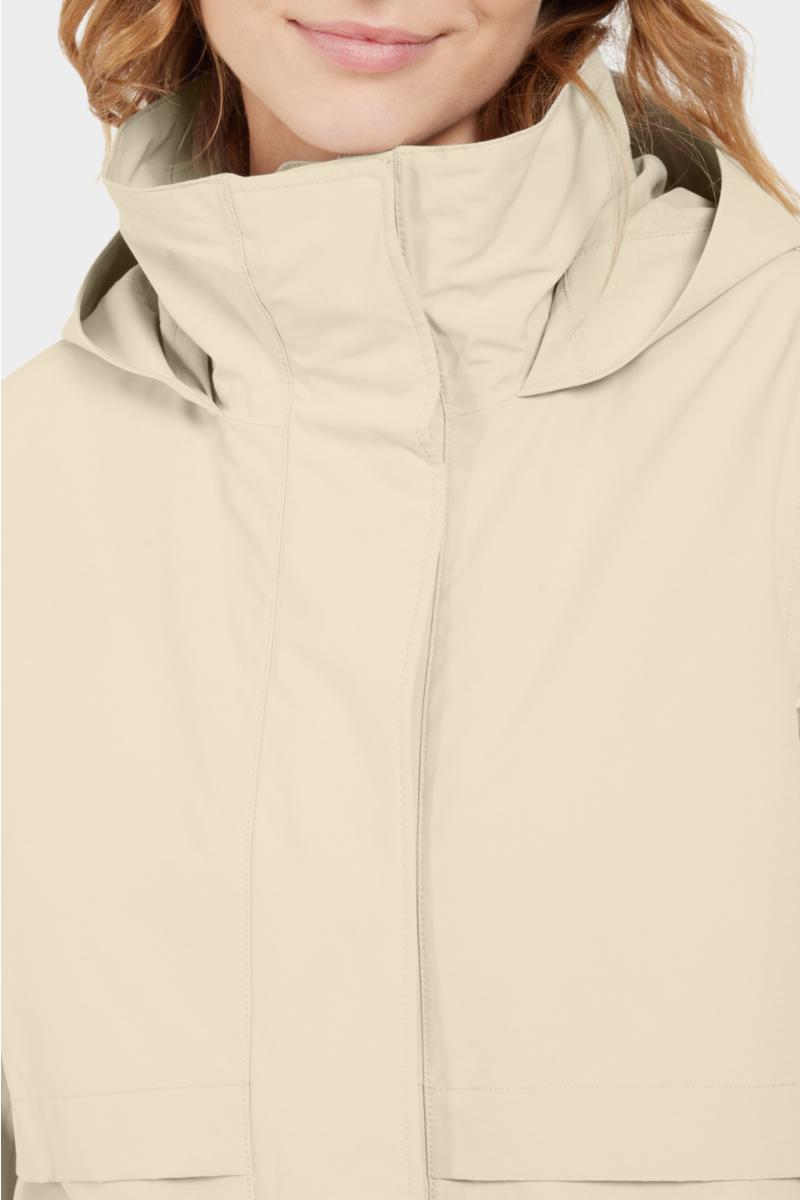 Den faste hetten og den innvendige ståkragen gir ekstra beskyttelse mot kulde, mens sidelommene med knapper gir praktisk oppbevaring. Mansjettene kan justeres med knapper for å holde varmen inne. Parkasen har en PFC-fri, vannavvisende overflatebehandling. Vindtett, vanntett og pustende allværskåpe, med minimum 10.000 mm vannsøyle.