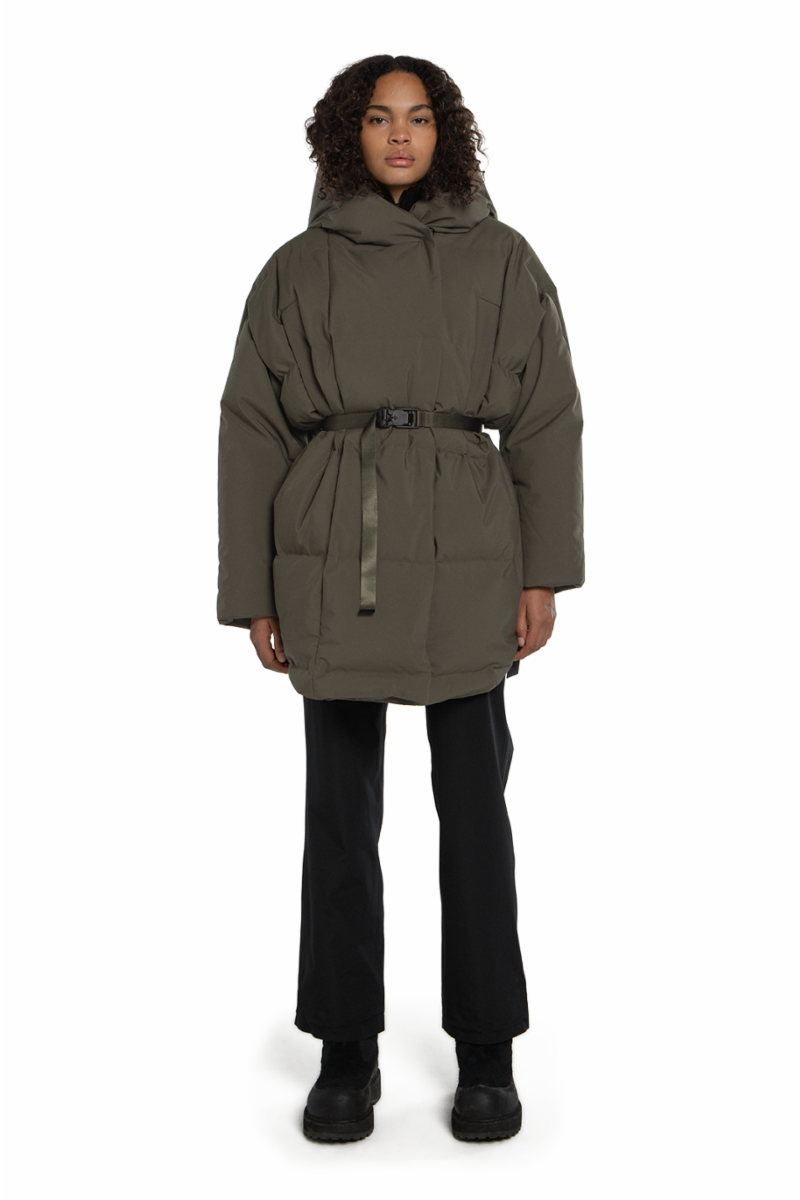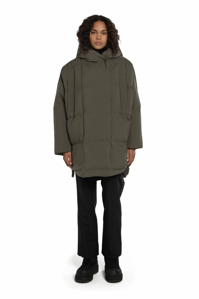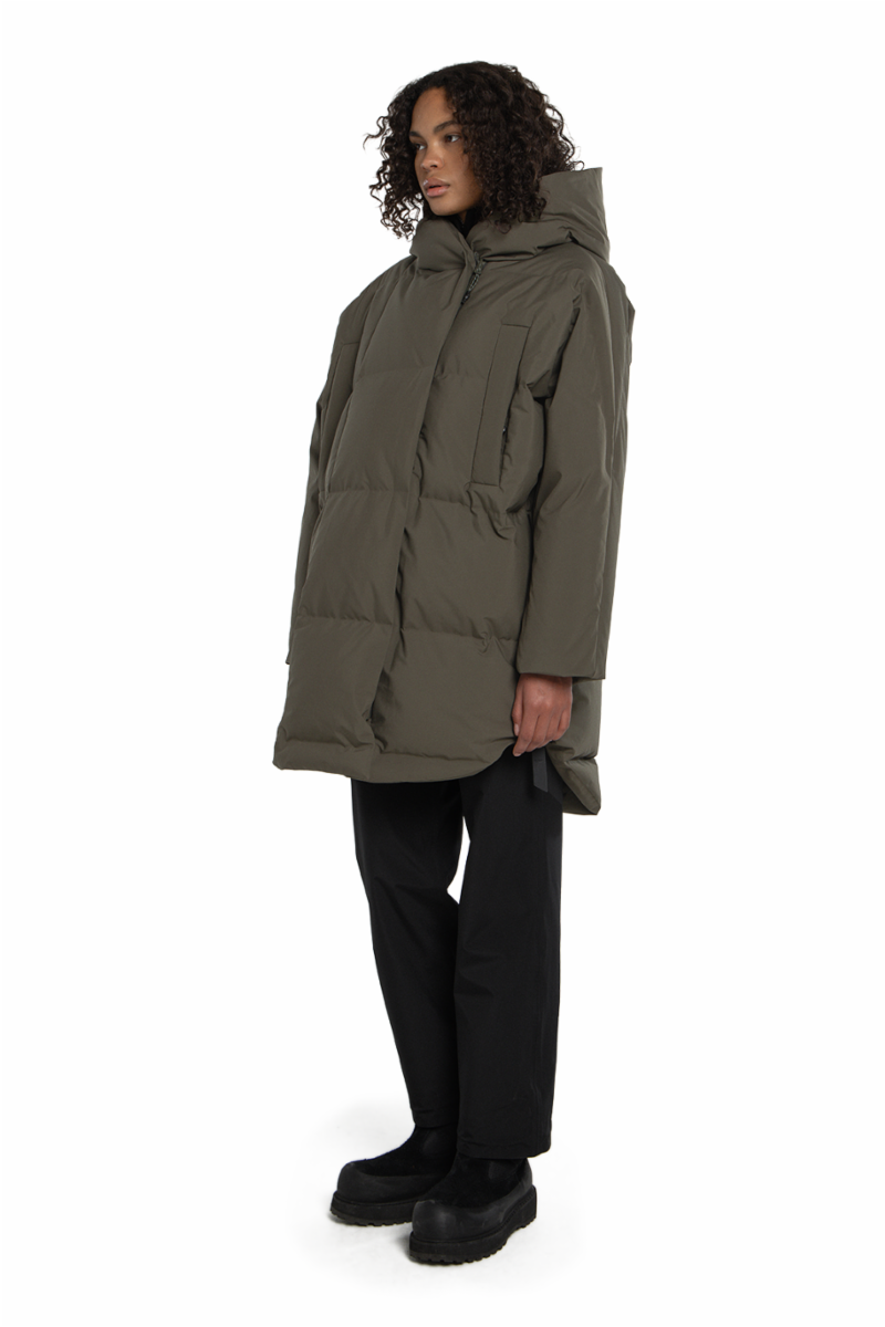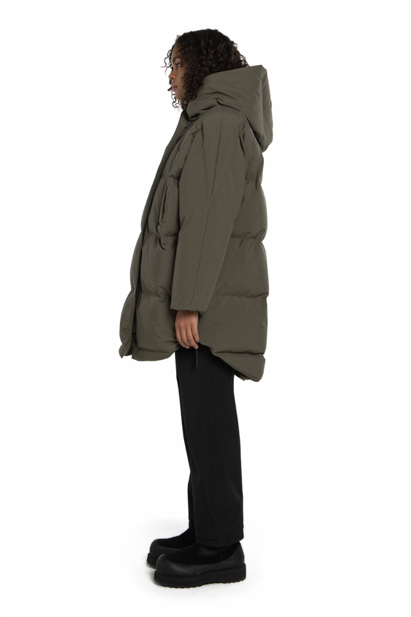 Spitsbergen er en lettere pufferjakke med oversized passform. Silhuetten ligner på en løs poncho, siden den er bredere rundt brystet, skulderen og ermhullene sammenlignet med vanlige pufferjakker.