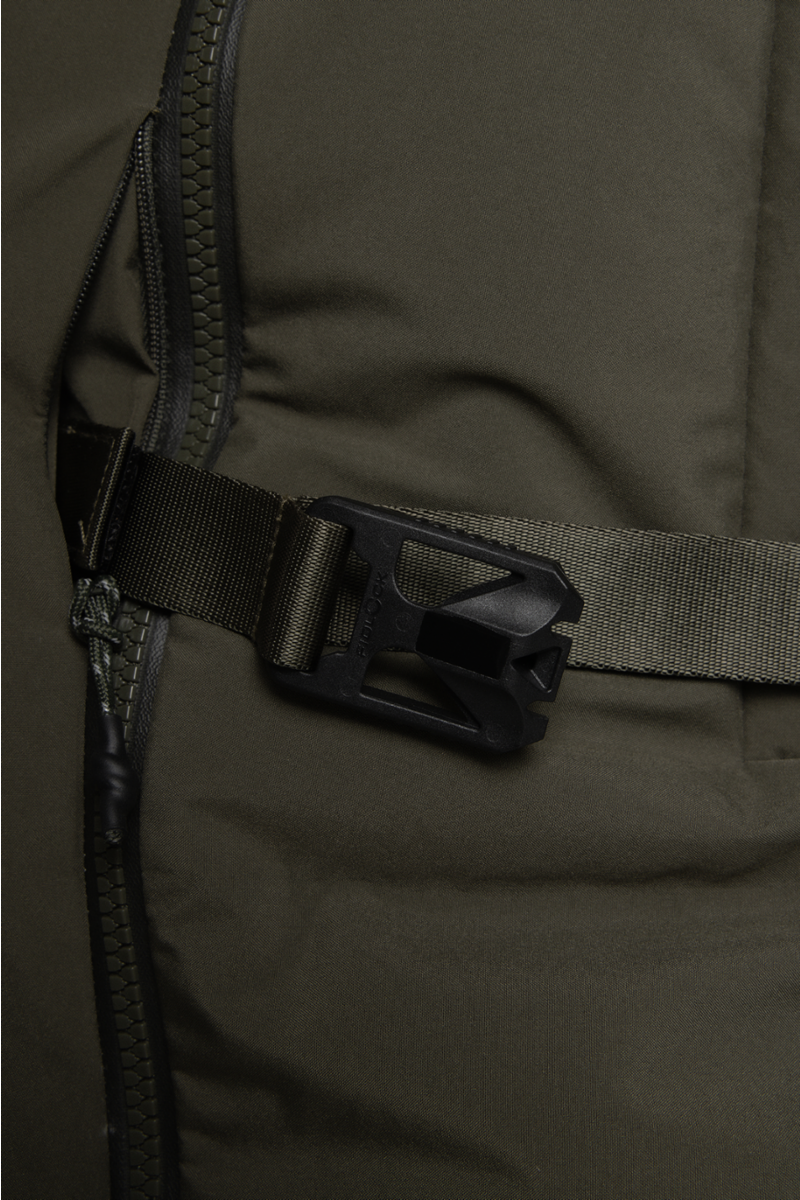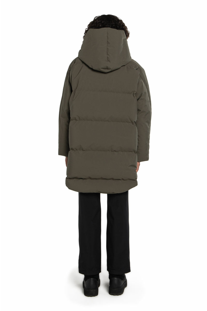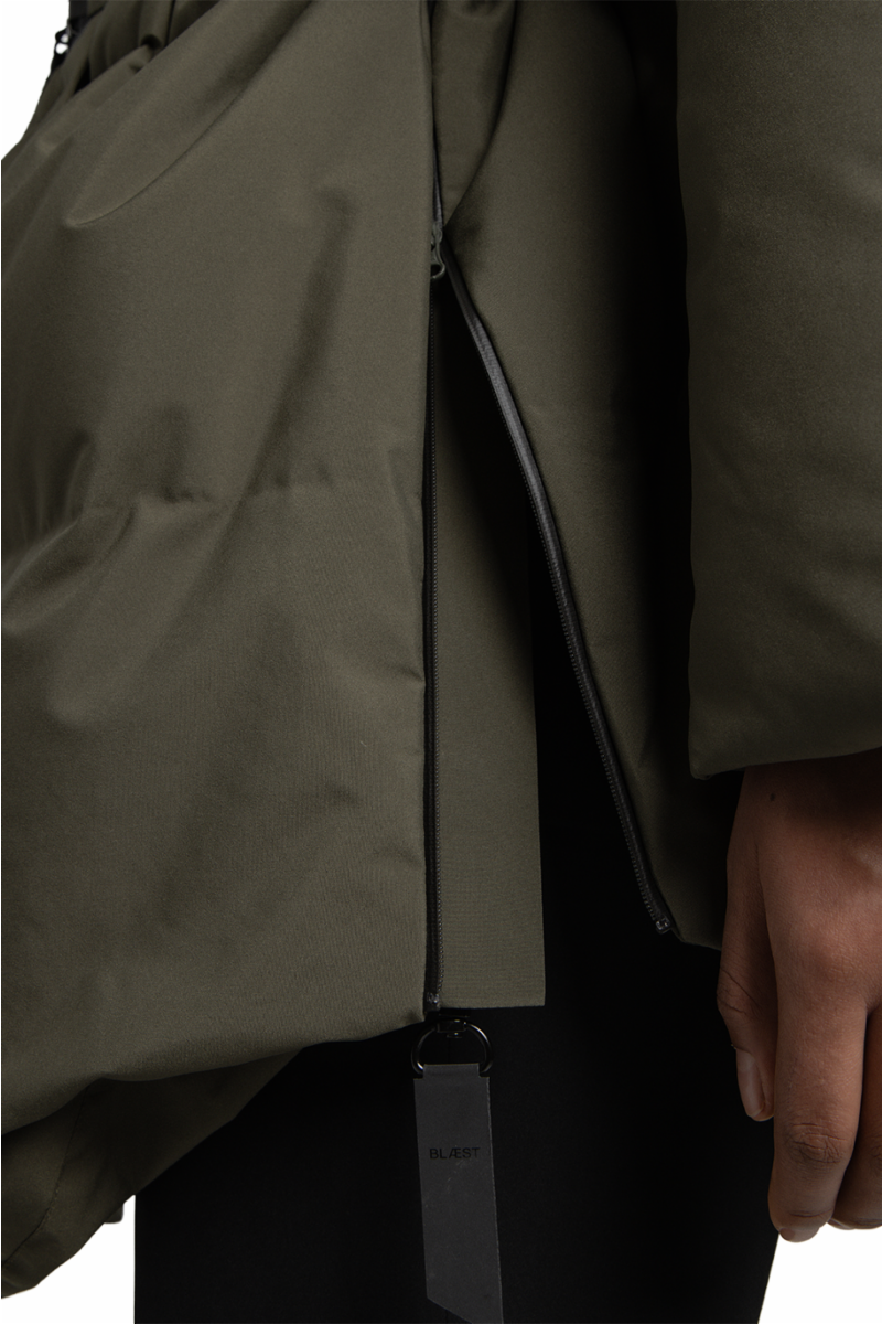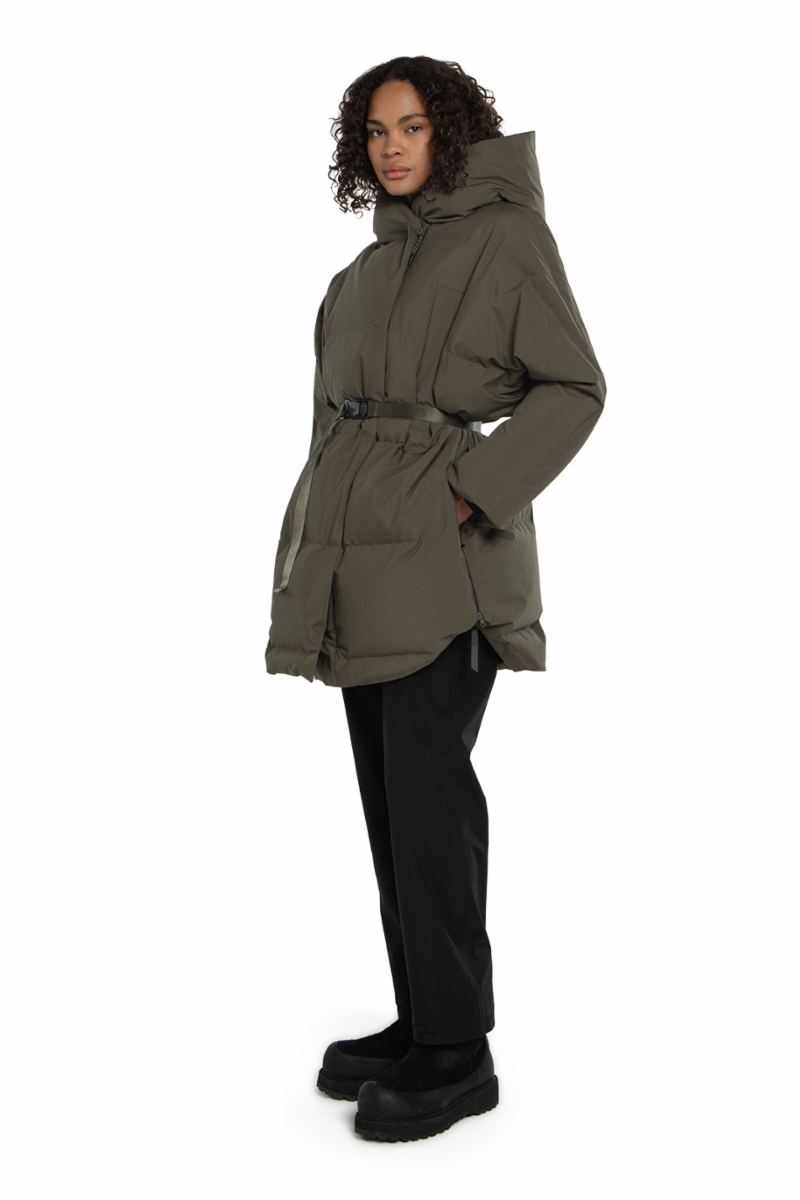 Spitsbergen er en lettere pufferjakke med oversized passform. Silhuetten ligner på en løs poncho, siden den er bredere rundt brystet, skulderen og ermhullene sammenlignet med vanlige pufferjakker.