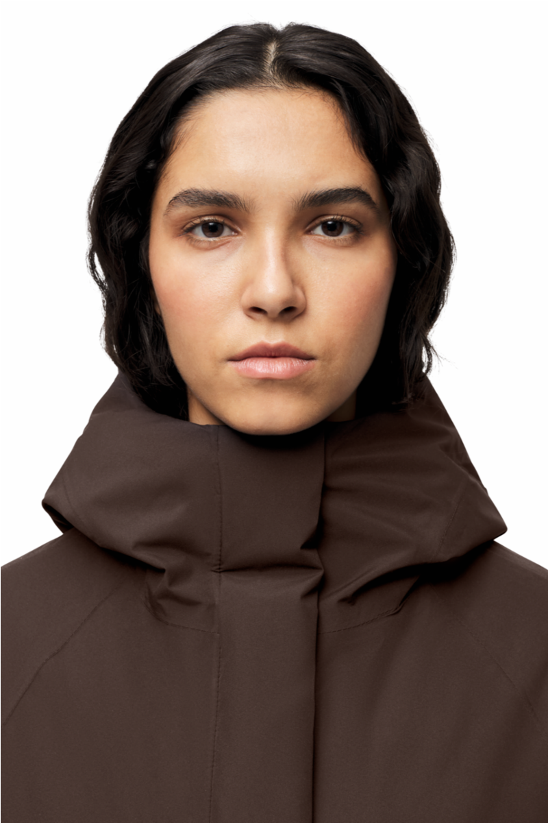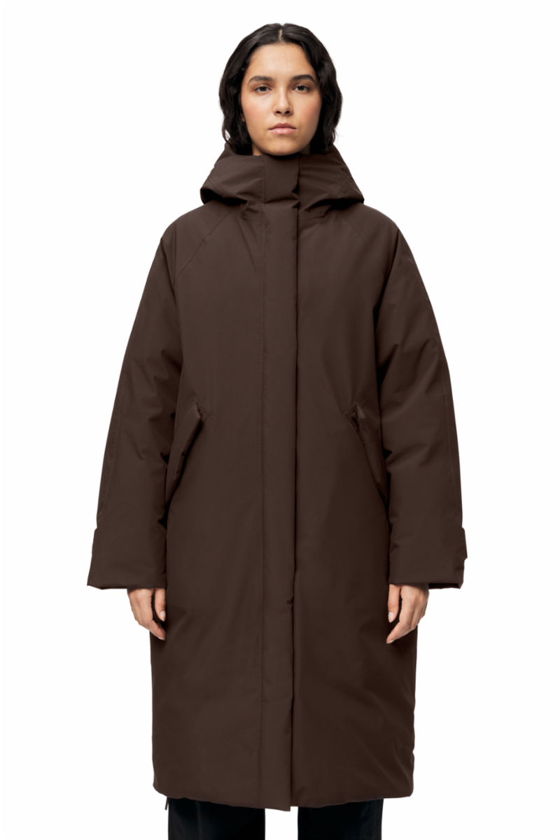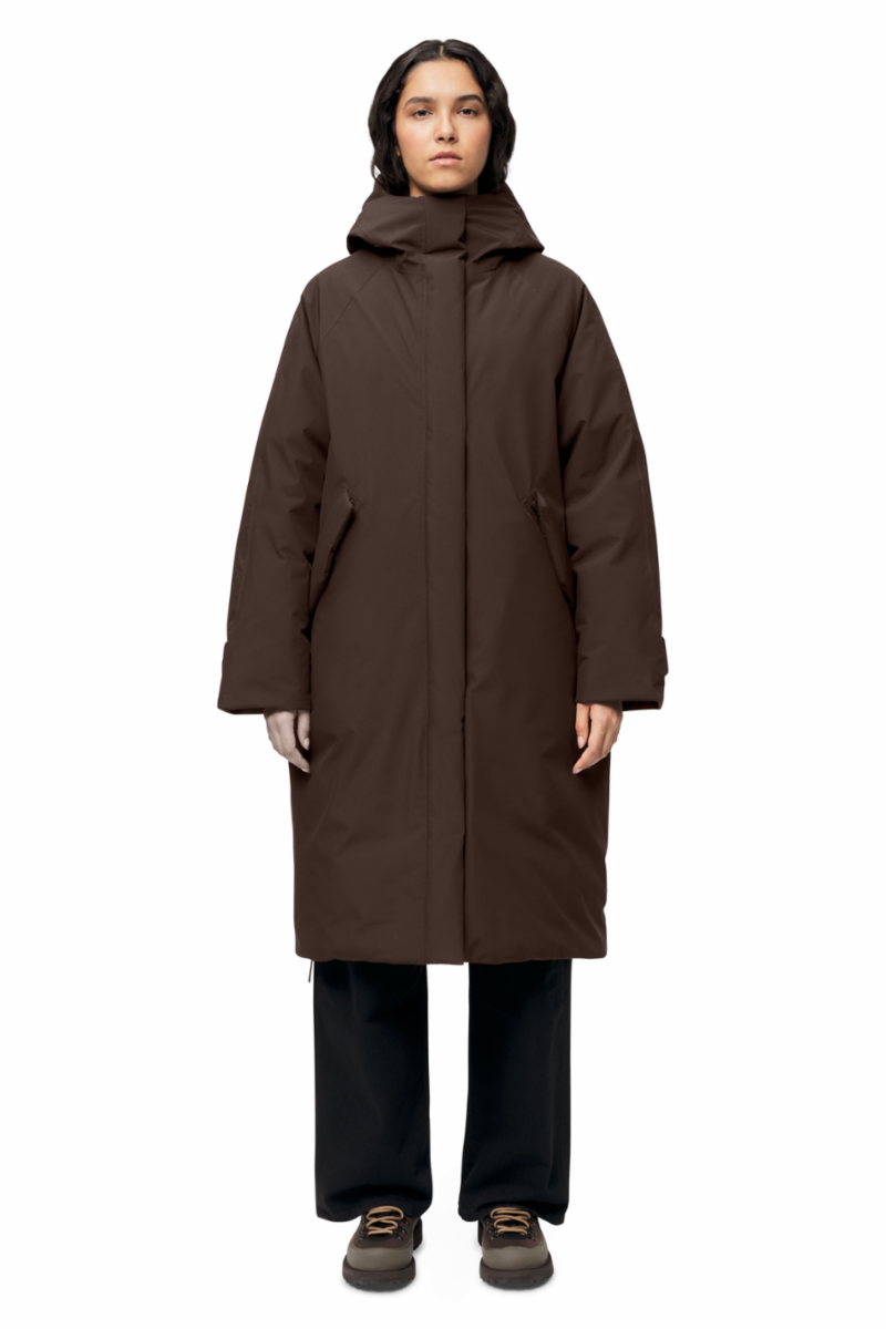 Røros Down Coat kommer i en avslappet passform som er normal i størrelsen, noe som gir den en komfortabel og uanstrengt følelse. Kuttet gjør det enkelt å legge på lag uten å se klumpete ut, noe som gjør det like praktisk for hverdagsbruk i byen som for utendørseventyr under kalde forhold. Fast hette med høy hals, i stilren design.