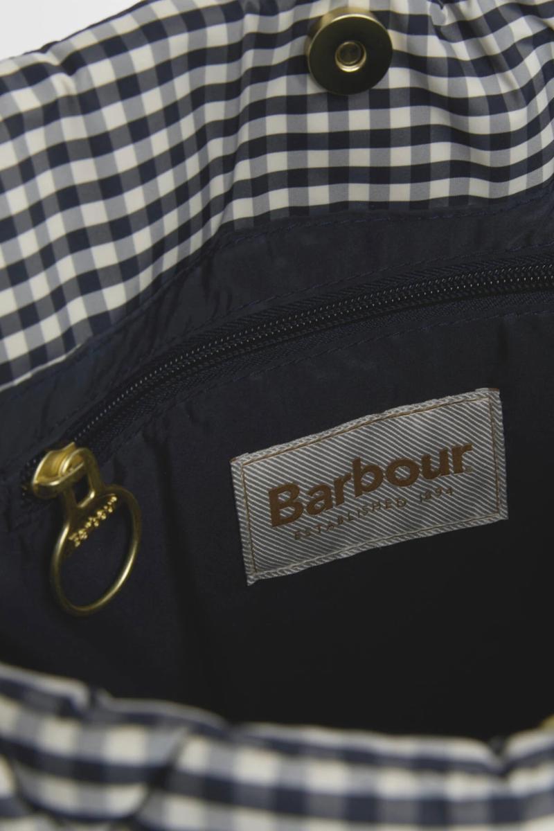 Barbour Riah Quilted Tote Bag er et stilig og romslig tilbehør med et vattert gingham rutete design med et XL diamantdynemønster. Den kommer med polstrede håndtak for komfortabel bæring, en tartan-trimmet innside for en klassisk touch, og en sikkerhetslomme med glidelås for ekstra funksjonalitet. Trykklåsen sikrer at eiendelene dine holder seg trygge, noe som gjør den til en perfekt blanding av eleganse og funksjonalitet.