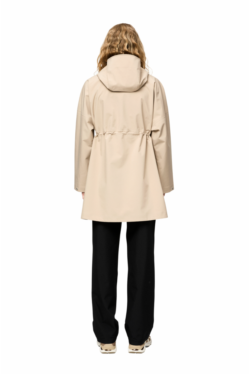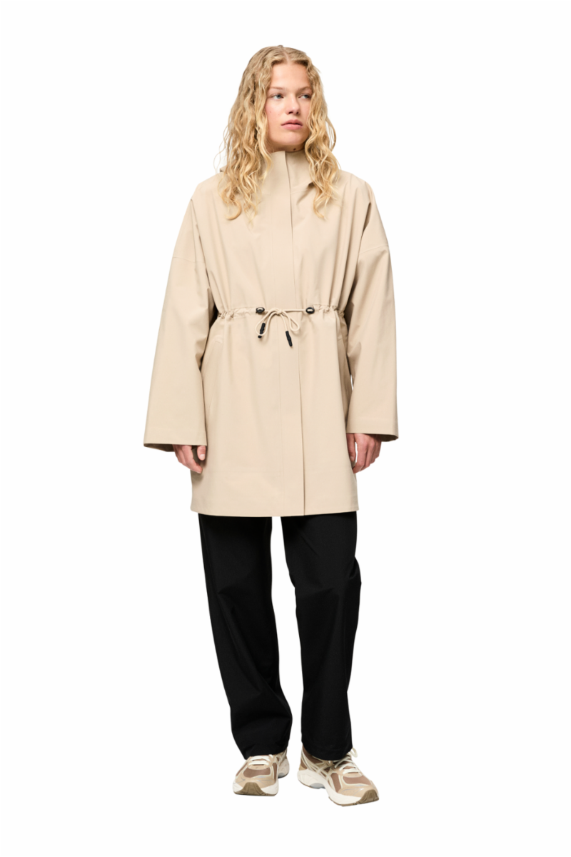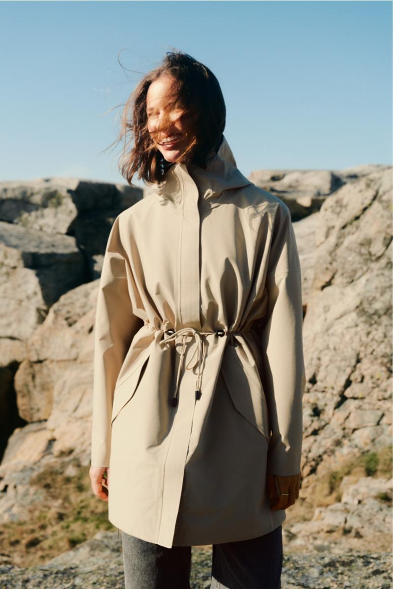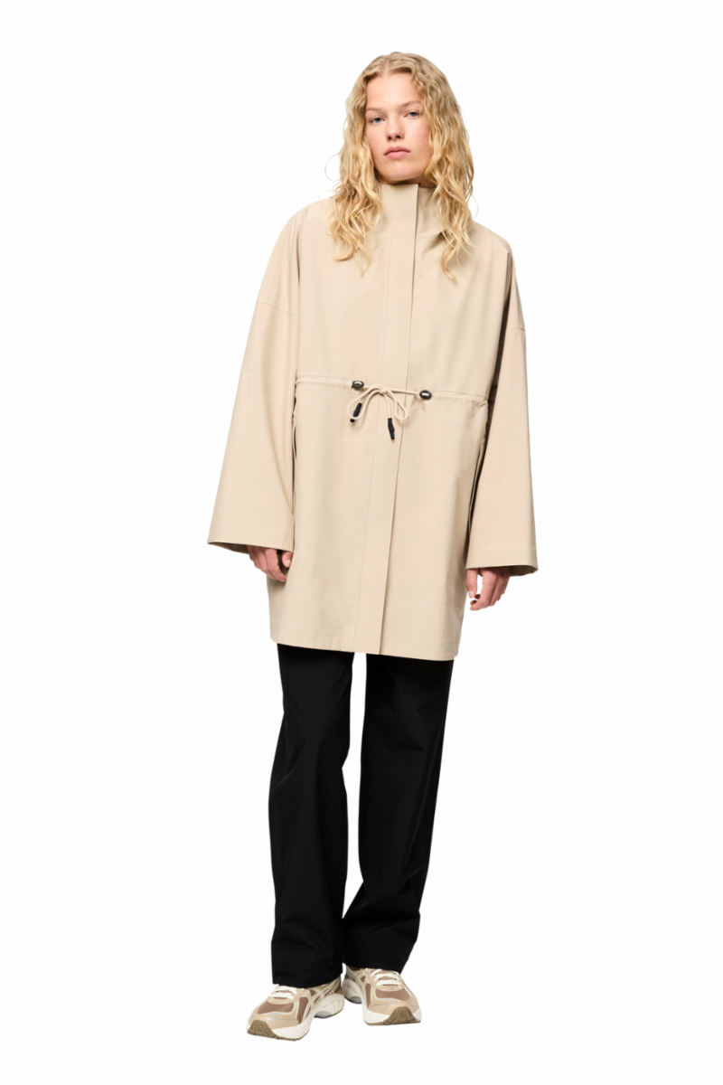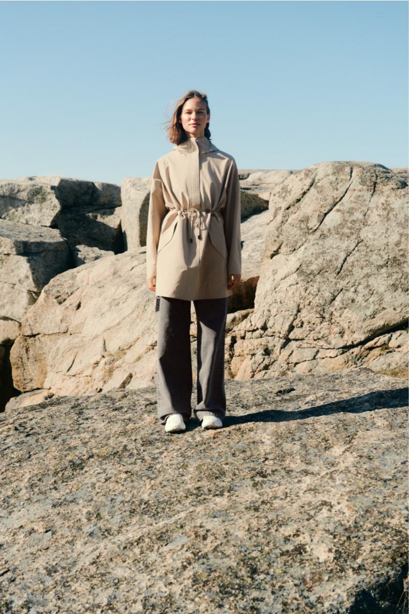 Med sitt slanke design og funksjonelle funksjoner tilbyr Flisnes en moderne og minimalistisk versjon av den klassiske tech-trench. Den er laget av et høykvalitets 3-lags skallstoff som er vanntett, pustende og vindtett. Kåpen er kuttet med drop shoulders og bred silhuett, men den justerbare snøringen i midjen gjør det mulig å tilpasse passformen.