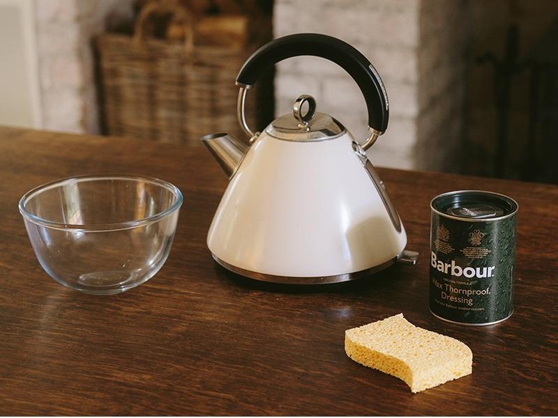 Take a tin of Barbour Wax Thornproof Dressing. Remove the lid, and stand the tin of dressing in a container of water hot enough to soften the wax. It should take approximately 20 minutes to melt the wax into a liquid consistency.